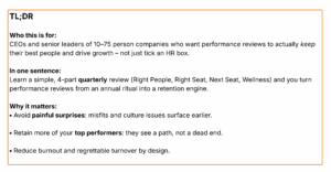 If you run this conversation once a quarter, you get three extra chances a year to keep the right people in the right seats, for longer.